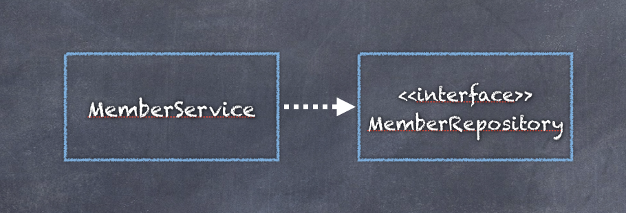 MemberService라는 객체는 MemberRepository를 사용하여 정의한 메소드를 수행합니다. 코드레벨에서 의존관계를 표시하면 아래와 같습니다. ( MemberRepository는 마커 인터페이스입니다. )