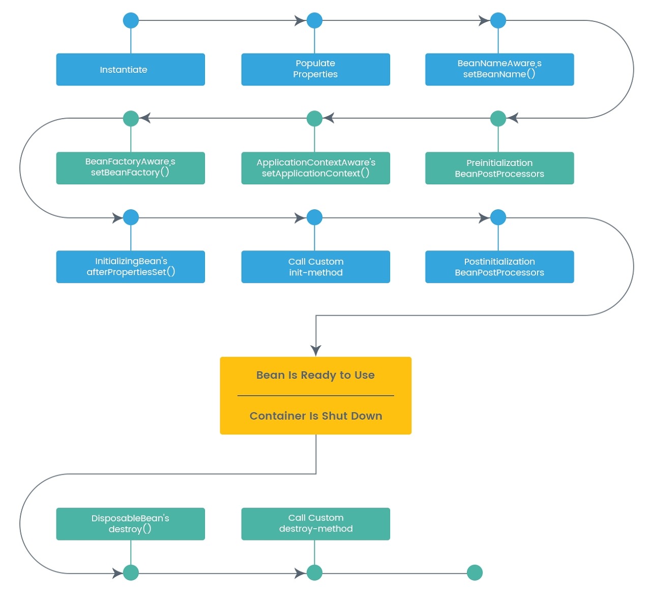 위 내용과 관련하여 반드시 알아야되는 내용이 또 있습니다. 바로 IoC Bean의 Scope와 라이프 사이클입니다. 등록된 Bean은 생성만 되는 것이 아니라 소멸이 되기도 합니다. 소멸에 대한 명시를 코드에 직접해줄 수 있지만 보통 Container가 Shutdown 되면서 자동으로 호출하기에 간단한 CRUD 구현에서는 별도로 명시를 하지 않았습니다.