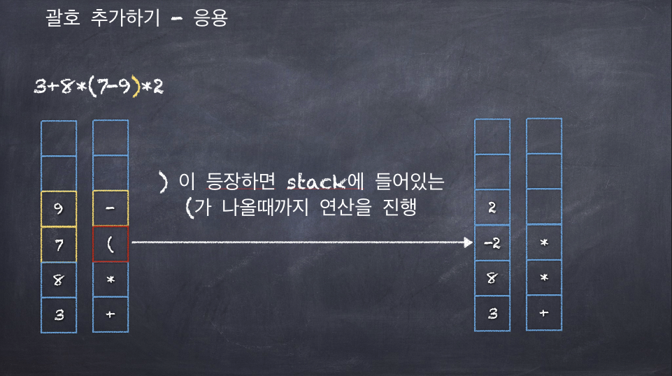 즉 빼기 연산자를 탐색하는 위치에서 이전 연산자를 확인하고, 이전 연산자가 곱하기나 나누기라면 그때 먼저 연산을 하고 자료구조에 넣어줍니다. 마지막에 오는 곱하기와 나누기는 순차적으로 푸는데 문제가 없기에, 연산을 마무리하면 됩니다.