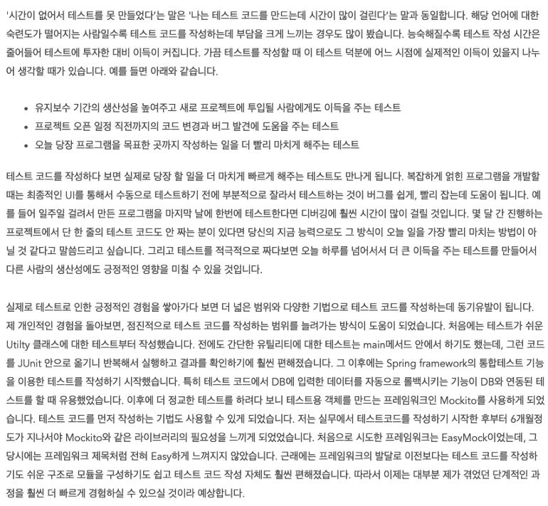 정말 공감가는 내용입니다. 그리고 한가지 더 추가하고 싶은 내용은 테스트에 대한 코드작성과 리뷰도 문화라는 생각이 많이듭니다. 기존에 코드에 테스트 코드가 없는데, 그걸 주니어가 붙잡고 있어서 테스트코드가 막 생기고 제대로 된 테스트가 될까라고 생각했을 때, 절대 아니라고 생각합니다. 이런 부분은 시니어, 미드레벨의 개발자분들도 그런 문화를 만들고, 테스트에 대한 내부적인 프로세스를 함께 만들어야 된다고 생각합니다.