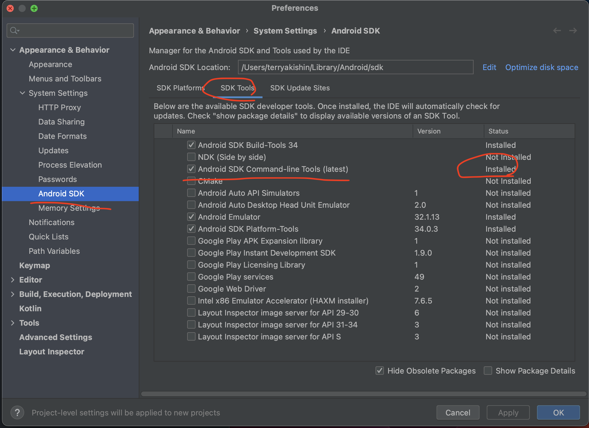 - 처음 설치한 상황에서 android SDK, x-code, android studio 설치가 안되었다고 표시되었고 아래 순서대로 설치 진행