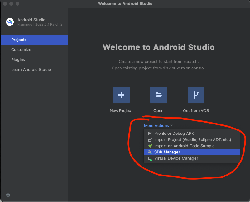 - 설치 후 실행 > More Action > SDK Manager 클릭